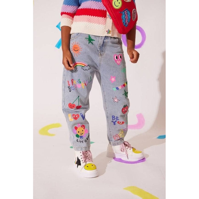 Description:Fun and colorful denim jeans featuring a vibrant array of graffiti-style graphics, perfect for adding a playful touch to your little one's wardrobe.Unique doodle art designs include cheerful icons like suns, rainbows, hearts, and positive phras