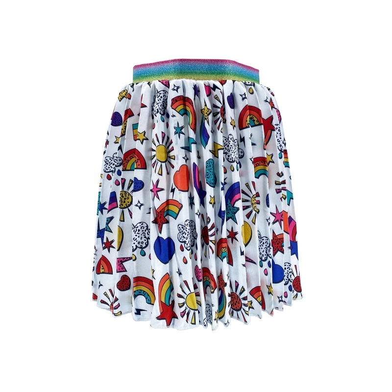 - A lively pleated skirt featuring a graffiti-inspired design with vibrant rainbows, hearts, stars, and abstract shapes.