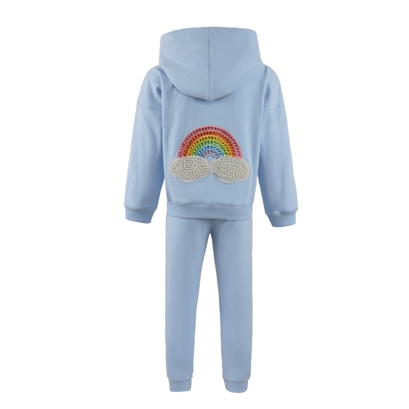 - Pastel blue two-piece set featuring a sparkling rainbow and cloud patch design on the back of the hoodie for a playful touch.