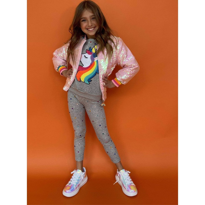 Description:Whimsical and comfy two-piece set featuring a rainbow unicorn sweatshirt and gem-studded leggings.Soft heather gray fabric with colorful embroidered gem accents for extra sparkle.Crewneck sweatshirt with a bold, happy unicorn graphic in vibrant