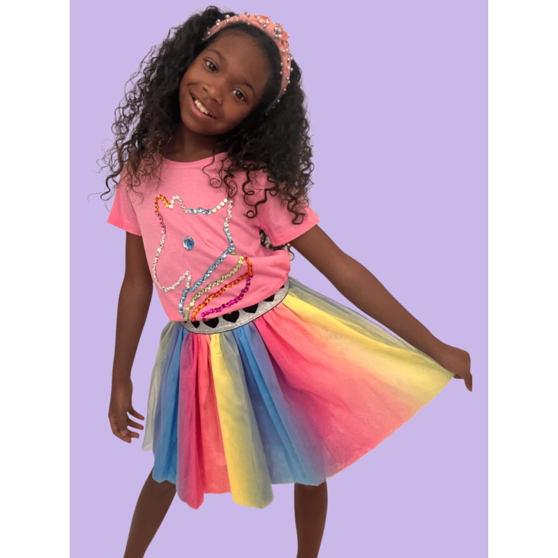 - Vibrant rainbow tutu skirt with soft pastel layers and a sparkly heart-accented waistband.