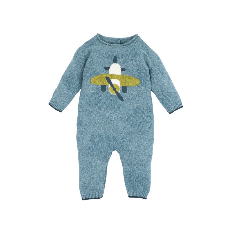 This stella blue marl plain knitted romper features a seed stitch cloud puff all over jacquard design, a boucle embroidered airplane graphic on the frontand a concealed crotch press stud opening for ease of dressing your little one, a must have for their W