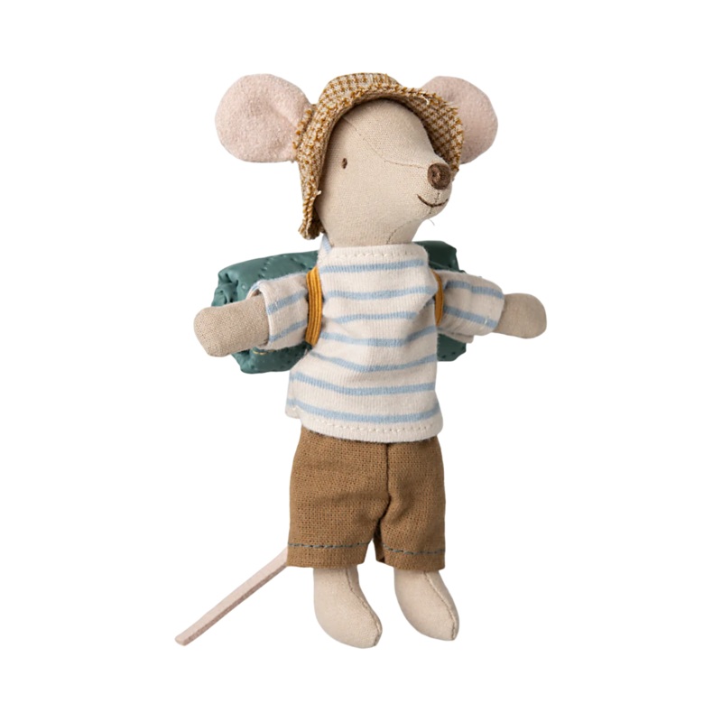 This mouse is well-prepared for a hiking trip in the wild nature. He is dressed for days of walking and brings his sleeping bag for nights under the stars. He has magnets in his hands. Add more accessories from the hiker collection for more play.