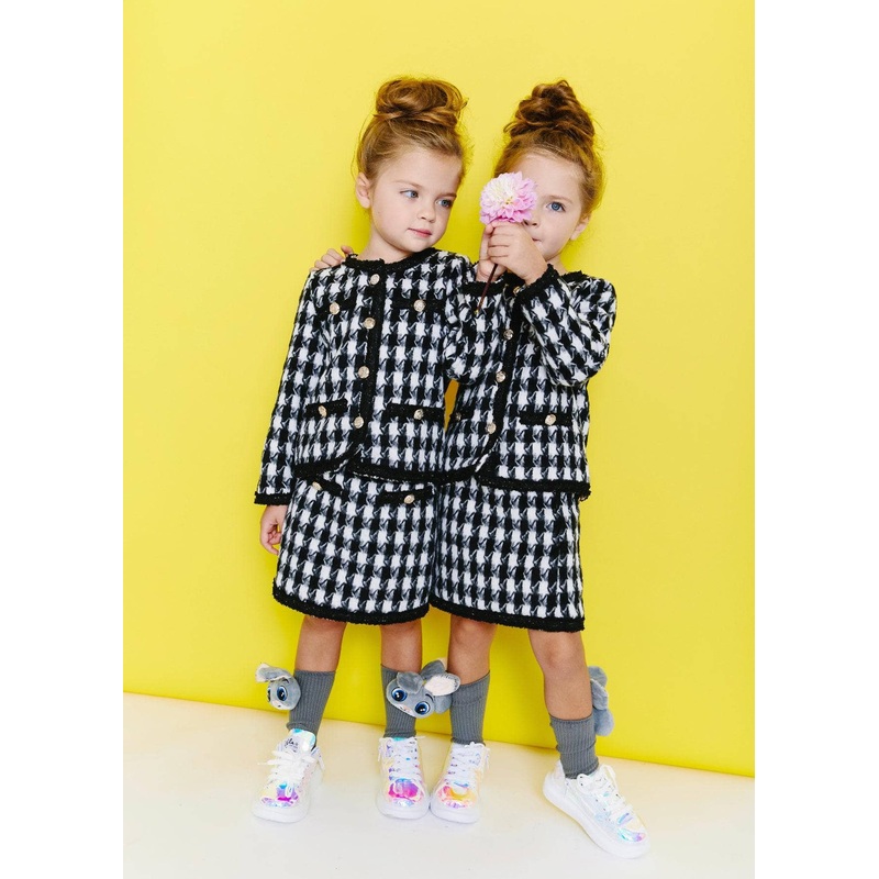 Description:Elegant houndstooth suit set featuring a tailored jacket with decorative gold buttons and a matching skirt.Classic black-and-white pattern with contrasting trim details for a polished, sophisticated look.Ideal for special occasions, holiday eve