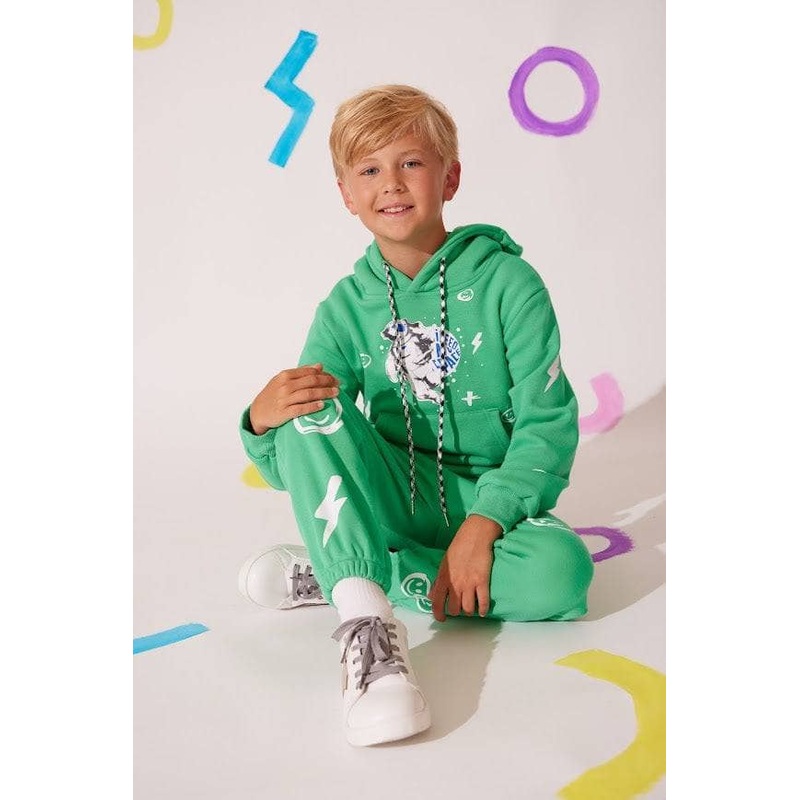 Description:Trendy green trackset with astronaut graphic, perfect for kids.Comfortable hoodie and joggers with space-themed prints, ideal for casual wear and play.Hoodie features a front pocket and adjustable hood.Joggers include an elastic waistband and c