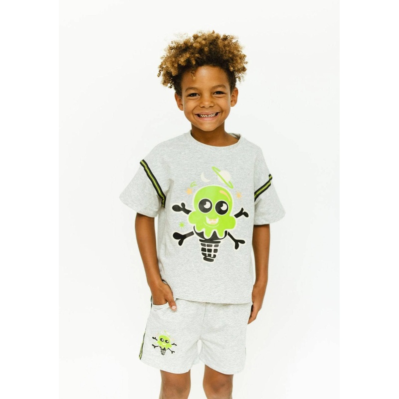 Description:A playful two-piece set featuring a fun green alien ice cream graphic with cosmic details for a unique, standout look.Includes a short-sleeve crewneck tee and elastic-waist shorts with matching side stripes for sporty flair.Designed in a soft,