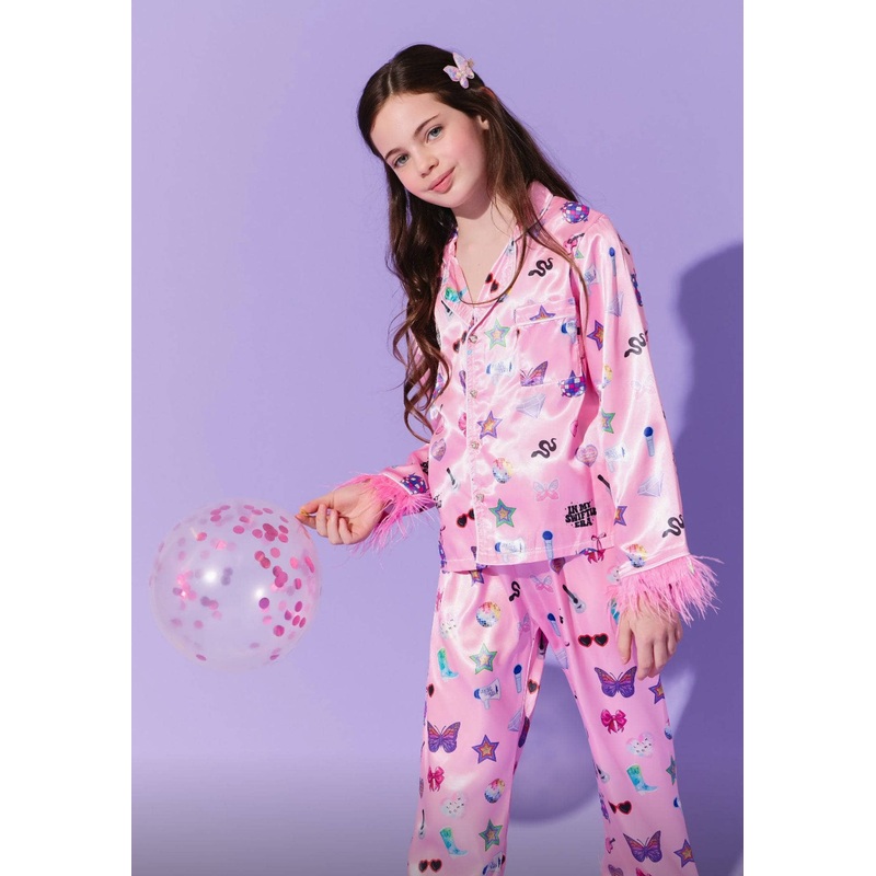 - Glamorous two-piece silky set featuring a vibrant Swiftie-inspired print with stars, hearts, and iconic motifs.