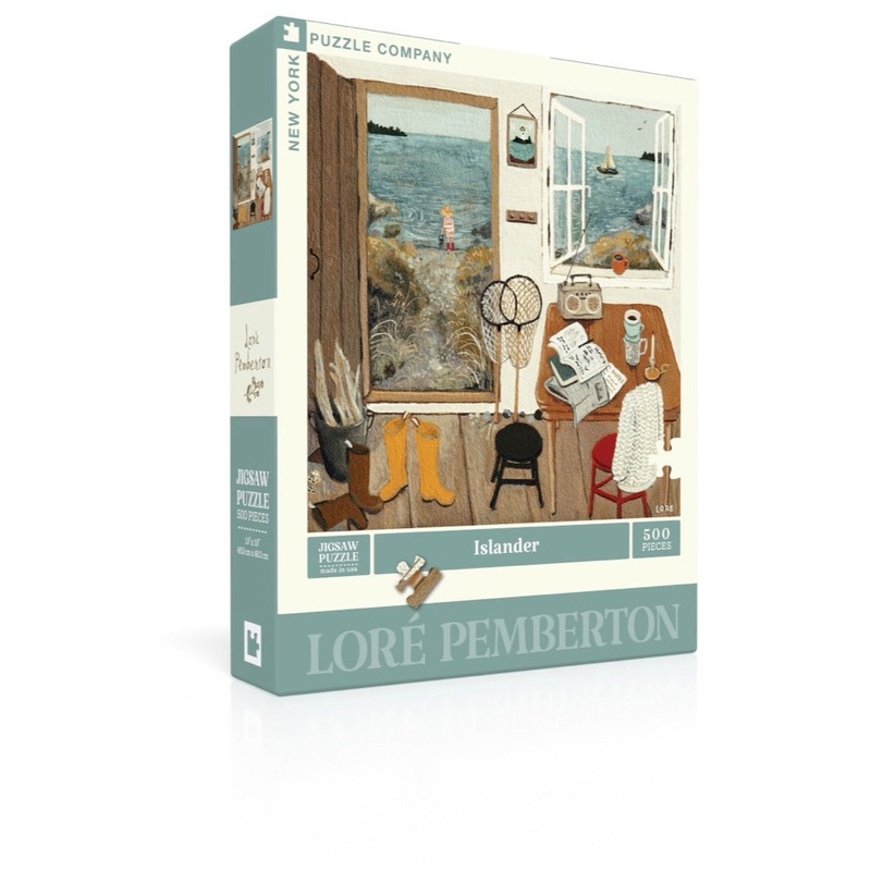 Step into a tranquil seaside retreat with Islander, a 500-piece puzzle capturing the essence of coastal life. This serene scene by artist Lor Pemberton invites you into a cozy cottage entryway, where fishing nets, tall rain boots, and driftwood gather near an open window. Through the doorway, a sailboat glides by as a woman stands along the shoreline, basking in the calm of the sea. With its inviting details, this puzzle is perfect for anyone who loves the quiet beauty of nautical life and makes a wonderful gift for the holidays.