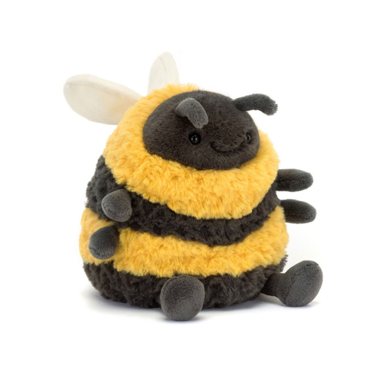 Albee Bee is the happiest little bumble. In thick yellow and black striped fur with little charcoal legs, Albee has a matching face with curved antennae. With a big, stitched smile and soft cream wings, Albee spreads springtime joy all year long!