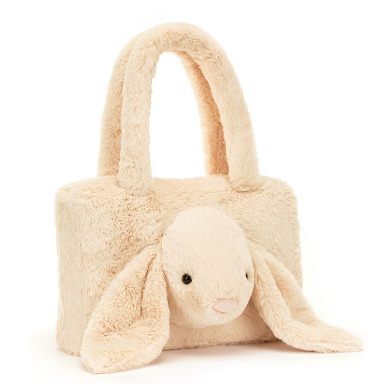 Turn heads as you bound into town with the Smudge Rabbit Tote Bag. This rich oatmeal bag has comfy fuzzy handles and a stunning lop-eared bunny head. Soft but sturdy, with a cotton lining and silver zipper with Jellycat tag, it's the kookiest way to carry