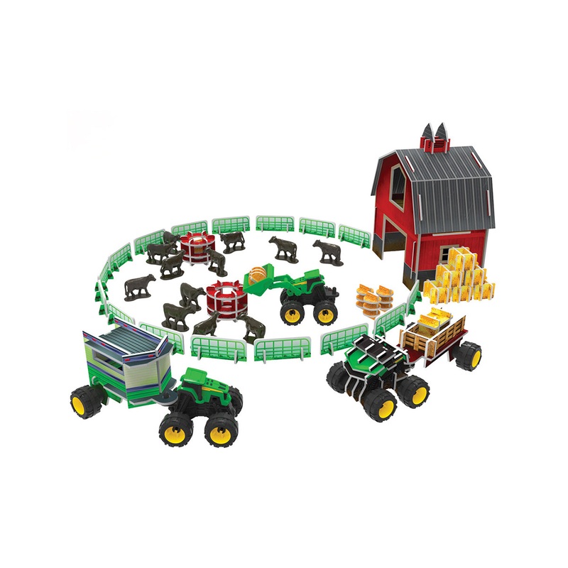 Young farmers can build their own farm with this John Deere Buildable Barn Set 47425. Packed full of fun, the set includes 203 sturdy pieces that allow you to build a barn, bales, fencing and more! Once created, your child is ready for imaginative play using the toy tractor to get around the farm. The tractor features free rolling wheels for plenty of push along fun. Twelve cows round out this play set, making it a real treat for farm to fans ages six and up. Includes 157 paper parts that can be used to make 1 barn, 18 fence pieces, 1 gator vehicle, 1 livestock trailer, 7 square hay bales, 5 round hay bales, 2 hay feeders, 1 stake wagon.