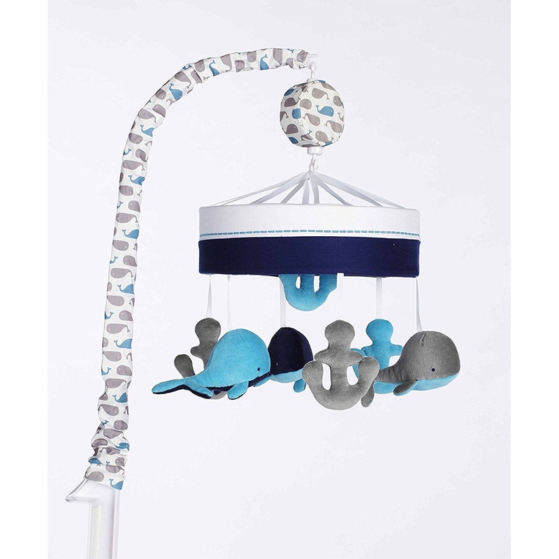 Whales and anchors swim overhead to a soothing lullaby, helping calm and entertain your little one. This mobile of plush characters coordinates with the Just Born? High Seas Nursery Bedding Collection. When prepping your baby's nursery every little detail
