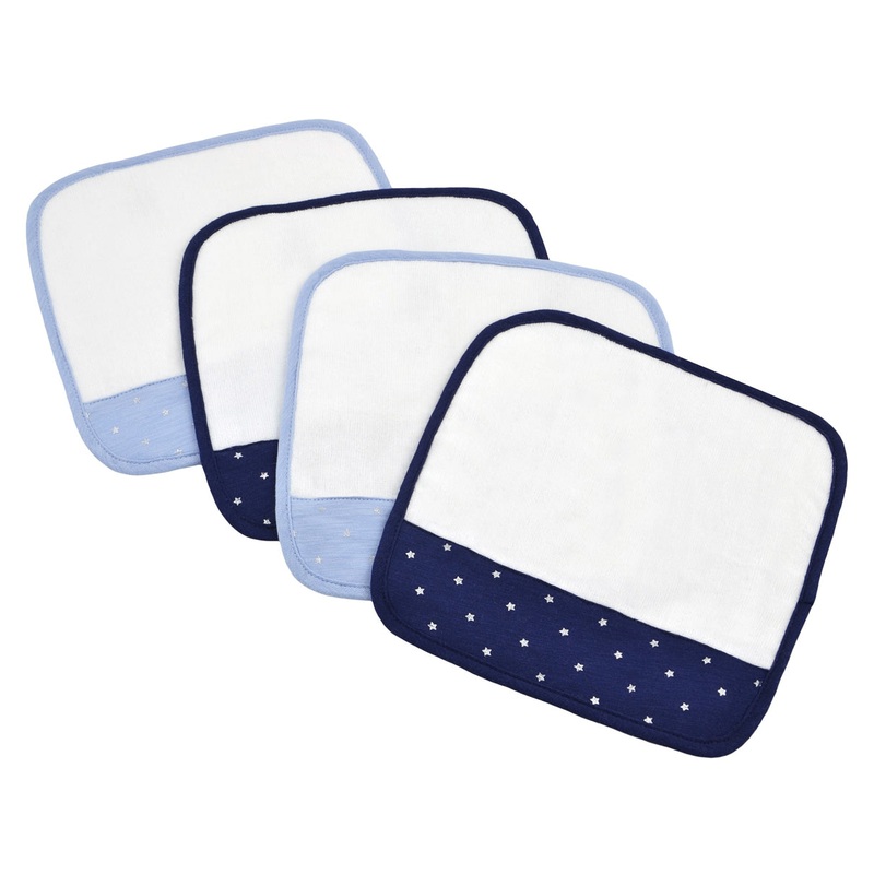 Your little one will glisten and giggle while washing up with Just Born?. This 4-pack of super soft washcloths comes in coordinating blue and navy colors with touches of silver shimmer. Designed with durable and soft materials our collection of washcloths