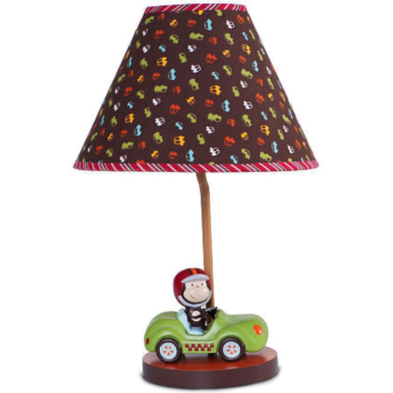 Accent your nursery with this Road Rally hand-painted resin lamp base featuring a monkey with his red helmet riding his green race car. Topped off with a colorful allover race car icon print flared lampshade. The lamp also includes an on/off in-line switch, an EVA protection bottom, is UL/CSA certified. Height of lamp is 15″ x 10″. Coordinates with the Kids line Road Rally bedding collection (sold seperately).