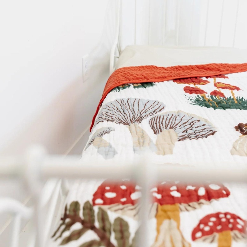 Clementine Kids’throw blankets are perfect for big kid beds (fits perfectlyon a twin) or getting cozy on the couch.On one side, you’ll find an assortment of the cutest mushrooms you can forage and on the other, a cheerful and rusty red color.