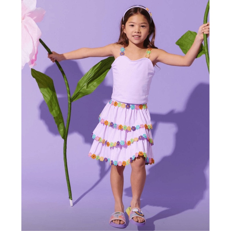 Description:Adorable two-piece set featuring a lavender tank top with floral strap accents.Tiered ruffle skirt adorned with colorful embroidered flowers for a playful touch.Perfect for warm-weather outings, parties, or adding a fun pop of color to any look
