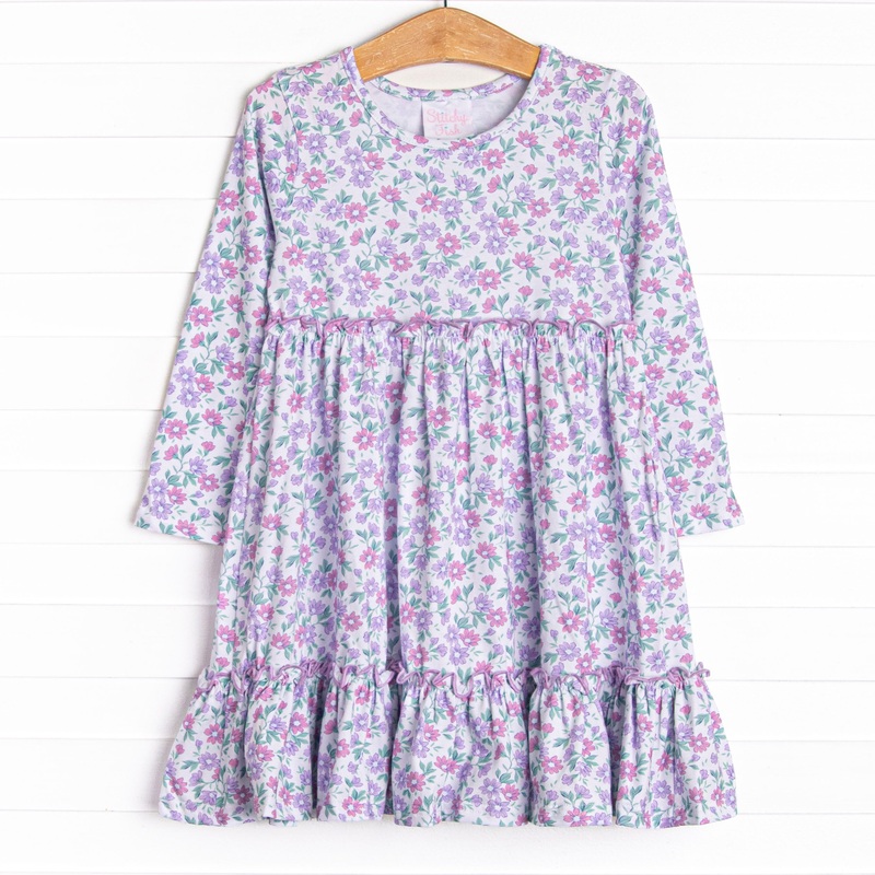 She will want to stay in that Lavender Haze!This dress features a lavender floral print, ruffle trim, and the softest knit material. This dress will be her go-to all Fall long!SIZE GUIDE95% Cotton/ 5% Spandex*Sibling Match Available