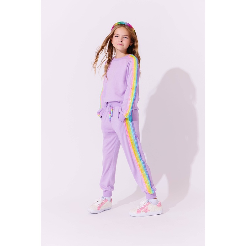 Description:Brighten up any day with this set, featuring vibrant rainbow sequin stripes on the sleeves and pant legs.Soft lavender hue and cozy fit make it ideal for all-day wear.Drawstring waist for a perfect, adjustable fit.Material & Care:Made from a co