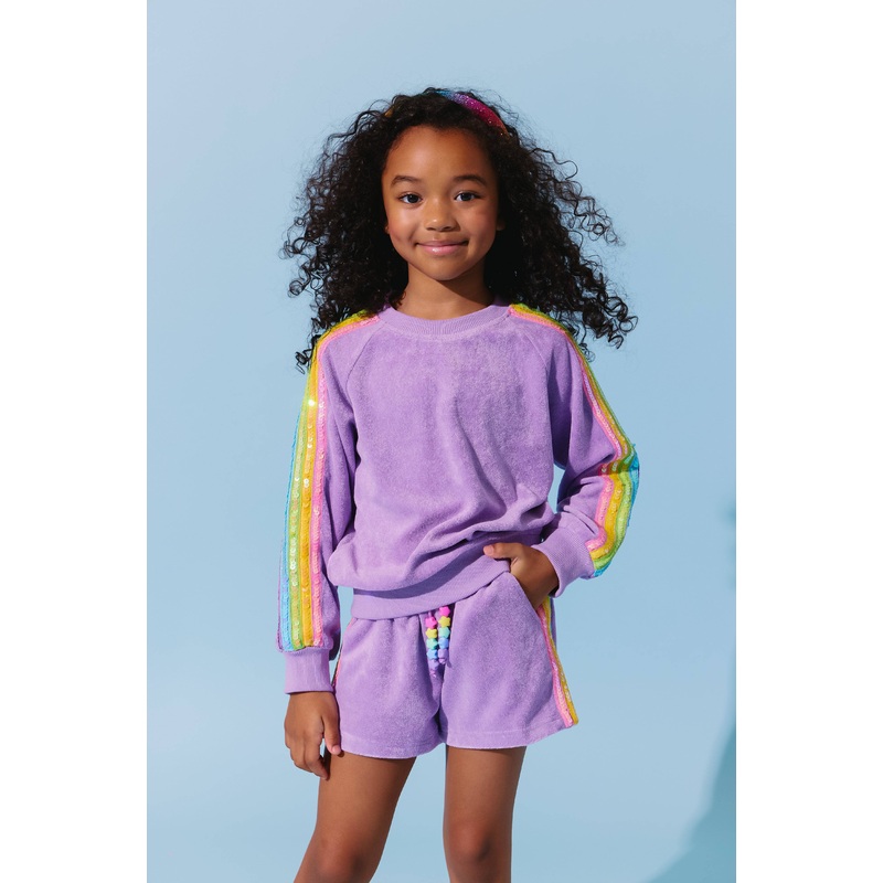 Description:Shimmering lavender short set with rainbow sequin stripes along the sleeves and sides.Long-sleeve sweatshirt with ribbed cuffs paired with matching shorts featuring an elastic waistband.A stylish and fun outfit, perfect for playdates, special o