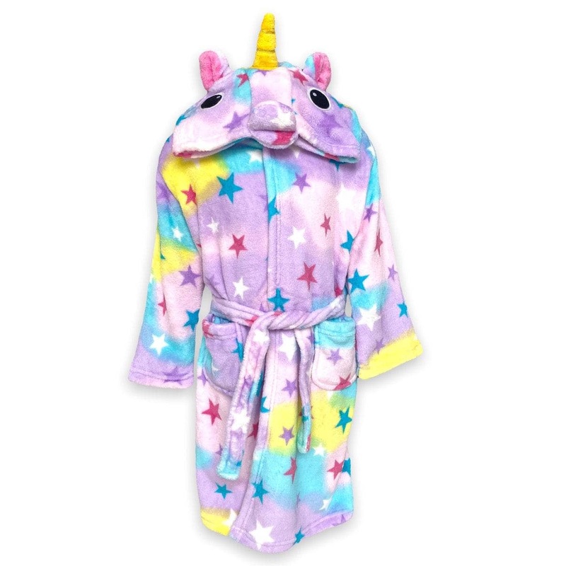 Description:Magical hooded robe featuring a 3D unicorn face, ears, and golden horn.Soft lavender fleece with colorful star print for extra whimsy.Belted waist and front pockets for cozy, stay-in-place comfort.A fun and cozy layering piece for bedtime, bath