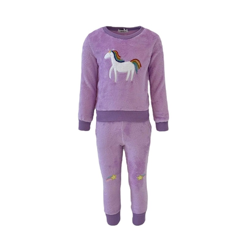 Description:Adorable two-piece set in soft lavender featuring a cozy sweatshirt with a rainbow-maned unicorn applique.Includes matching joggers with playful shooting star patches and ribbed cuffs for a snug and comfortable fit.Perfect for casual days or pl