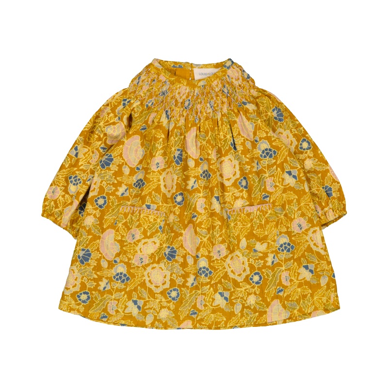 this sweet baby dress has smocking at the neckline and elastic sleeve openings. this dress is cut from lurex cotton voile which gives it a metallic pinstripe effect woven through the floral print.
