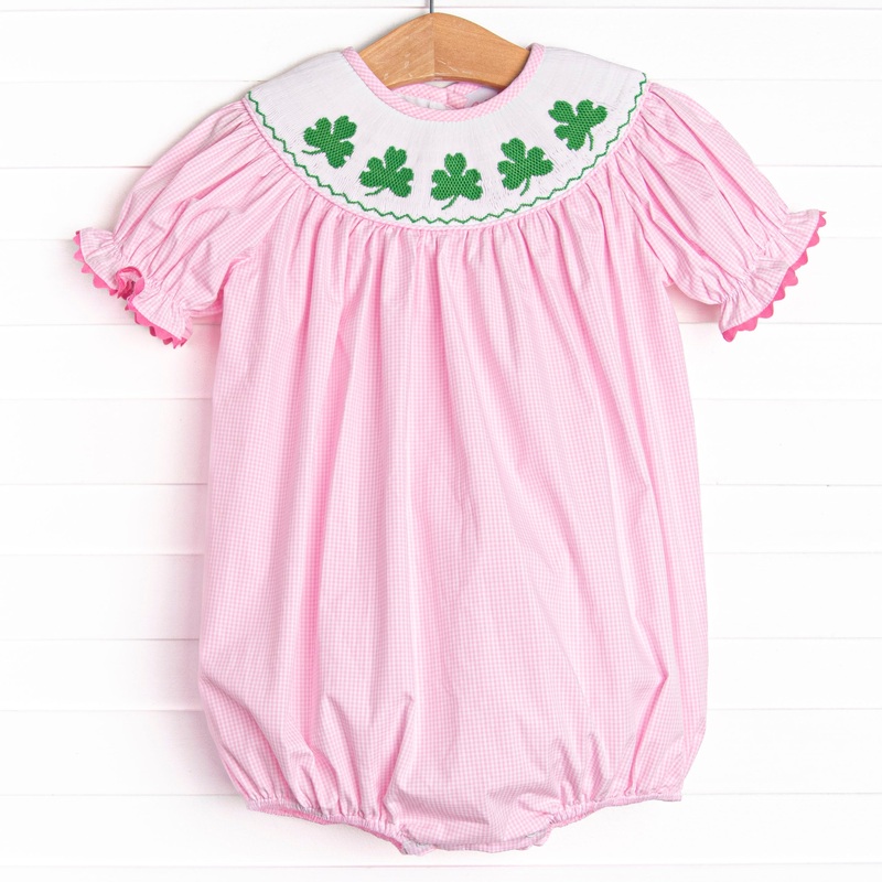 Lucky Me! This bubble features a pink mini gingham print, puff sleeves, and shamrock smockings. She will be the life of the Paddy!