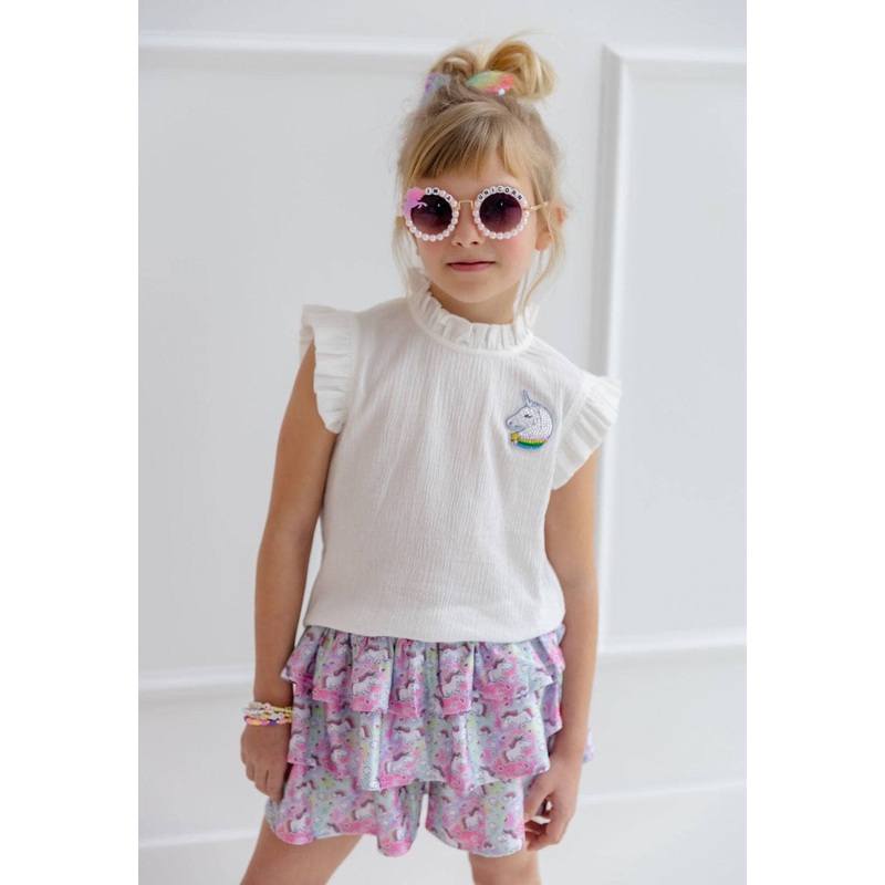 - Paired with tiered ruffle shorts in a playful unicorn print, this ensemble is perfect for playdates, parties, or any special occasion.