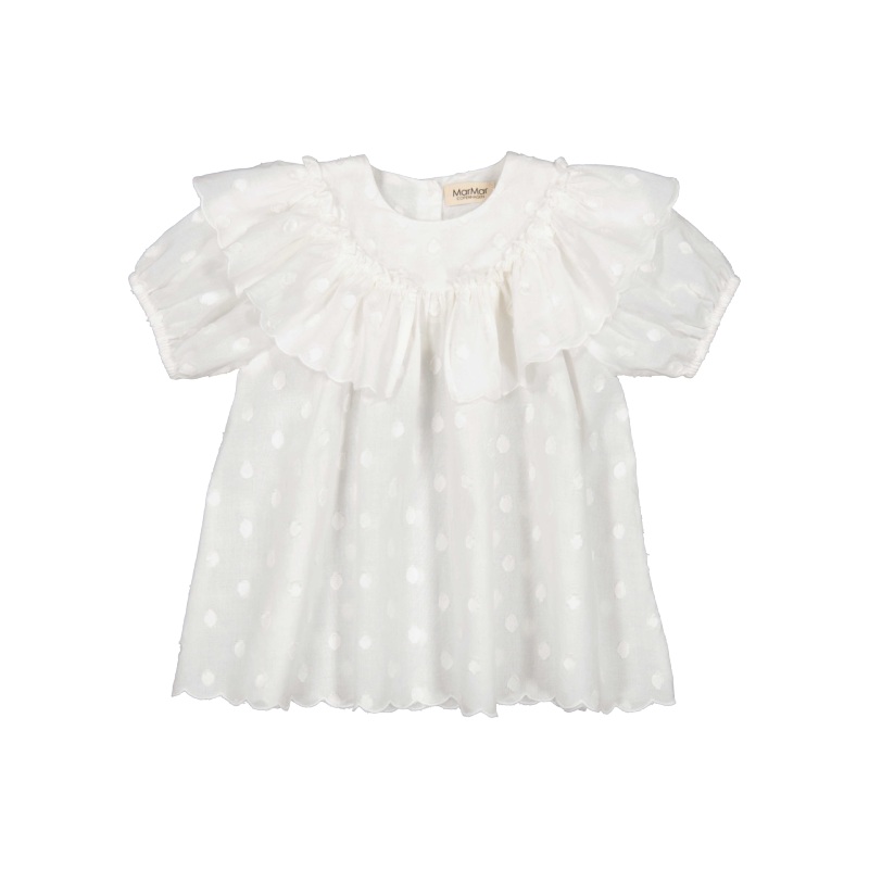 marmar copenhagen delsa baby dress in gentle white.this baby dress is full of pretty details with puffed sleeves, ruffles, a scalloped hemline and woven polka-dot texture.100% cotton, lining 100% cottoncertified according to standard 100 by OEKO-TEX