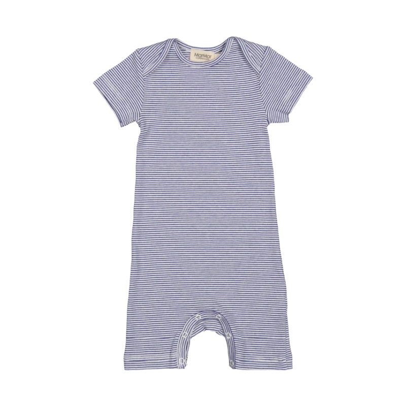marmar copenhagen roxi summer baby romper in blue stripe. this soft, short-sleeved romper has fine blue and white stripes, short legs and lapped shoulders for easy dressing. the romper has snaps at the crotch for easy diaper changes.