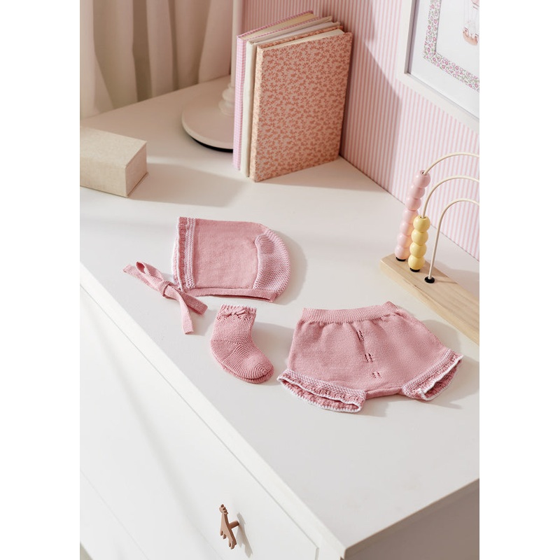 Three piece set for newborn.Exclusive knickers for newborn. Made using fine knit fabric that is soft to the touch. Decorative elements: decorative ruffles.Bonnet for newborn, perfect as an accessory to complete the look. Made using fine knit fabric that is