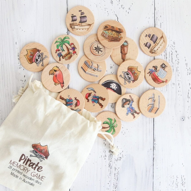 This pirate theme memory match game is incredibly versatile, perfect as a memory game, for open ended play or as an educational resource. Designed and made in Australia this 28 piece set has 14 different pirate themed prints and comes in a printed calico b