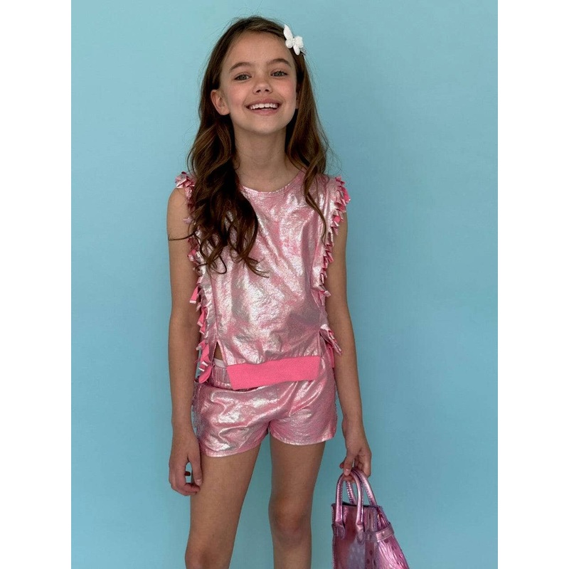 - Shiny two-piece set in a metallic pink finish, featuring a sleeveless top with ruffled fringe details and matching high-waisted shorts.