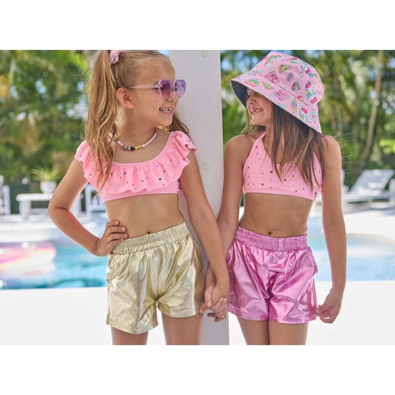 Description:Sleek metallic track shorts with a bold, high-shine finish for a standout look.Available in blue, green, pink, and goldperfect for adding a touch of glam to your workout gear or casual wardrobe.Elastic waistband shorts designed for a secure and