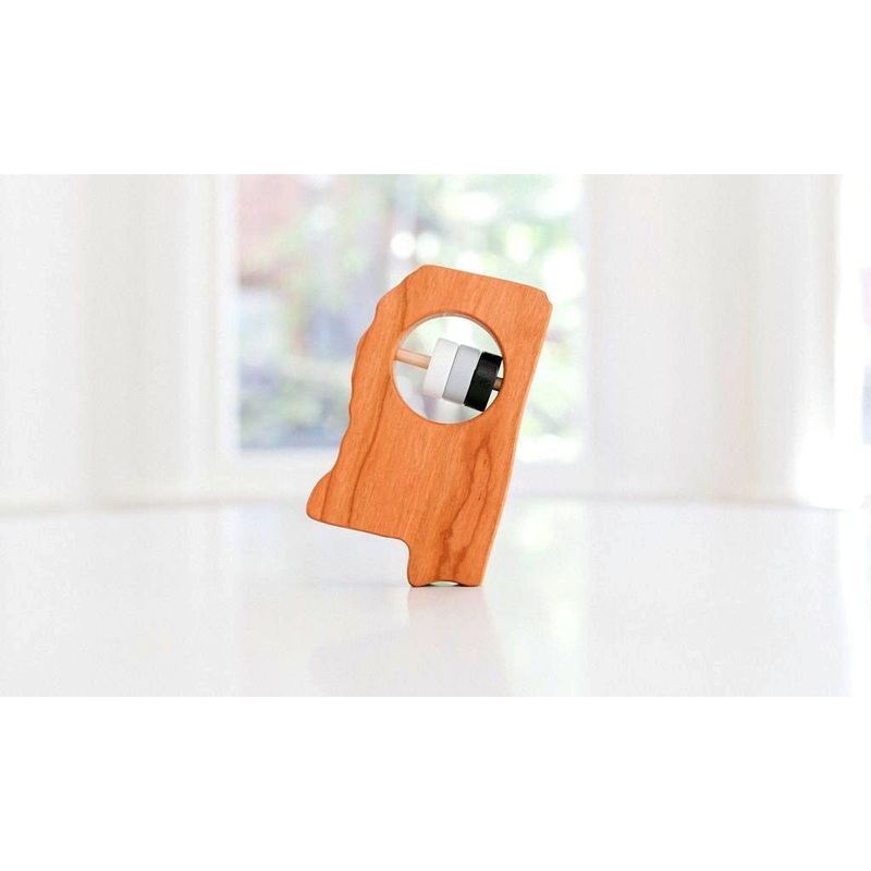 Show your state pride with the MississippiStateshaped baby rattle. This rattle is made from solid hardwood Cherry. This baby rattle is 100% organic, made from responsibly harvested woods, and is sure to last long enough to be passed down through several ge