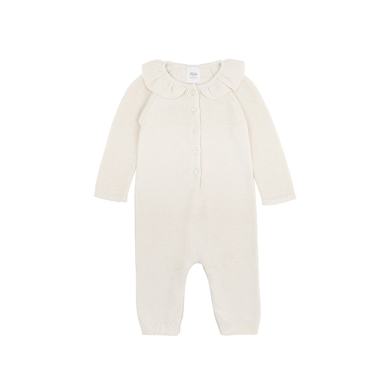 This gorgeous dusky pink 100% organic cotton garter stitch knitted romper features a frilled collar, contrast rib stitched yoke and sleeves, front placket button opening and concealed press stud crotch opening for ease of nappy changes and dressing, perfec