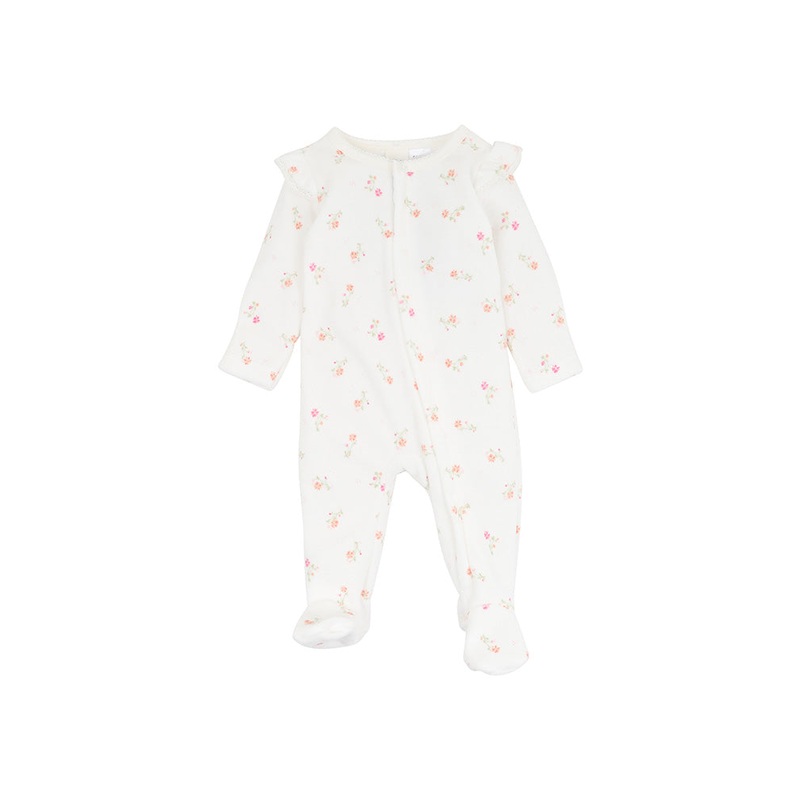 Warm and comfortable, this pretty ditsy print organic cotton blend velour romper features shoulder frills and front zip opening for ease of nappy changes and dressing your little one making it the perfect winter wardrobe staple.