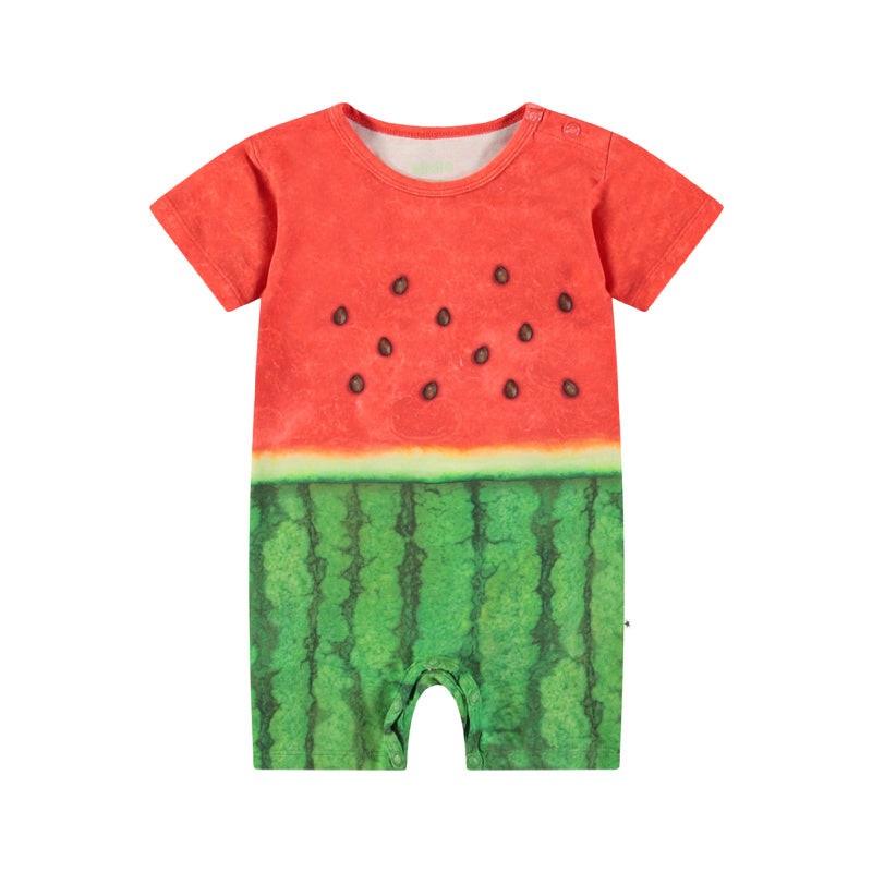 molo baby jumpsuit in organic cotton jersey for the little ones. the jumpsuit has short sleeves and legs, as well as button fastening on the shoulder and between the legs, making it easy to put on and take off. it has a spacious fit with plenty of room for movement, and features a “be a watermelon” print.