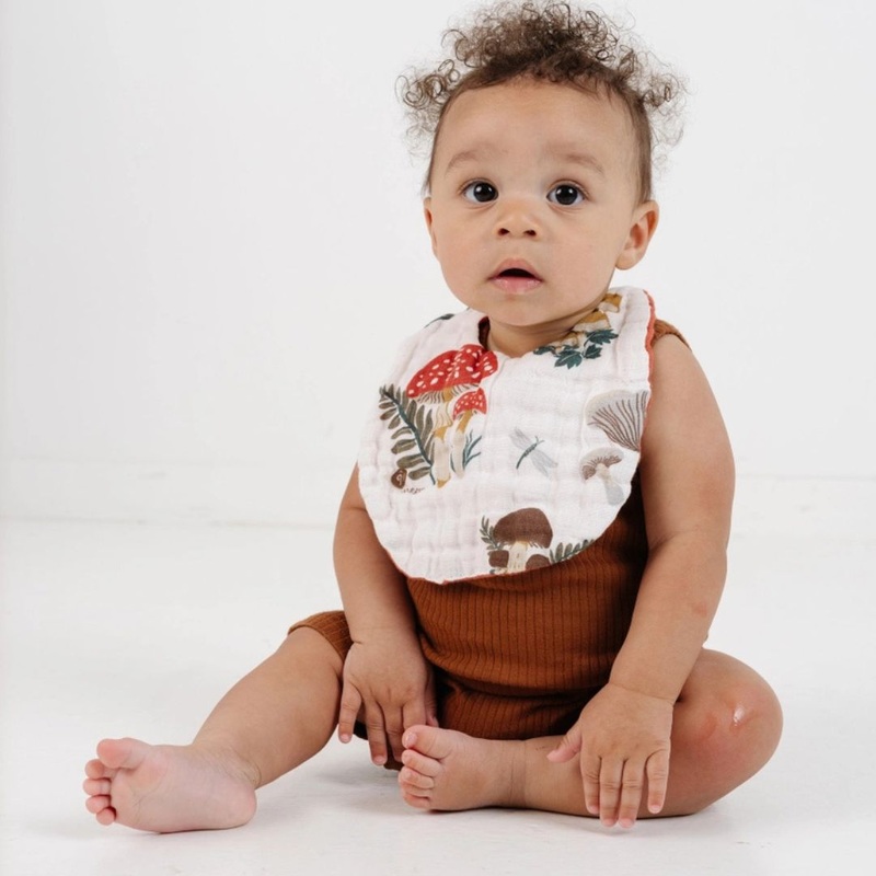 This adorable double-layered muslin bib is now available in one of our top-selling prints (mushrooms!) from Clementine Kids! 8-inch braided ties secure this bib in the bag, and it’s super absorbent, ready for little ones’ spills.