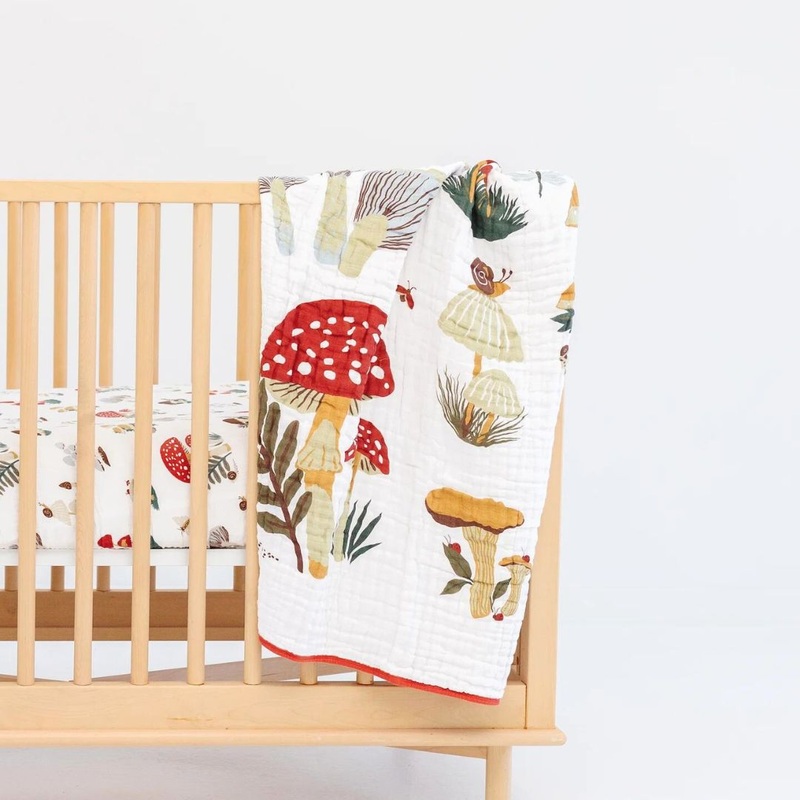 On one side of our Mushroom Quilt you'll find an assortment of the cutest mushrooms you can forage and on the other,a cheerful and rusty red color.Clementine Kids quilts are fourlayers of muslin layeredin a warm but breathable quilt that is perfect for nap
