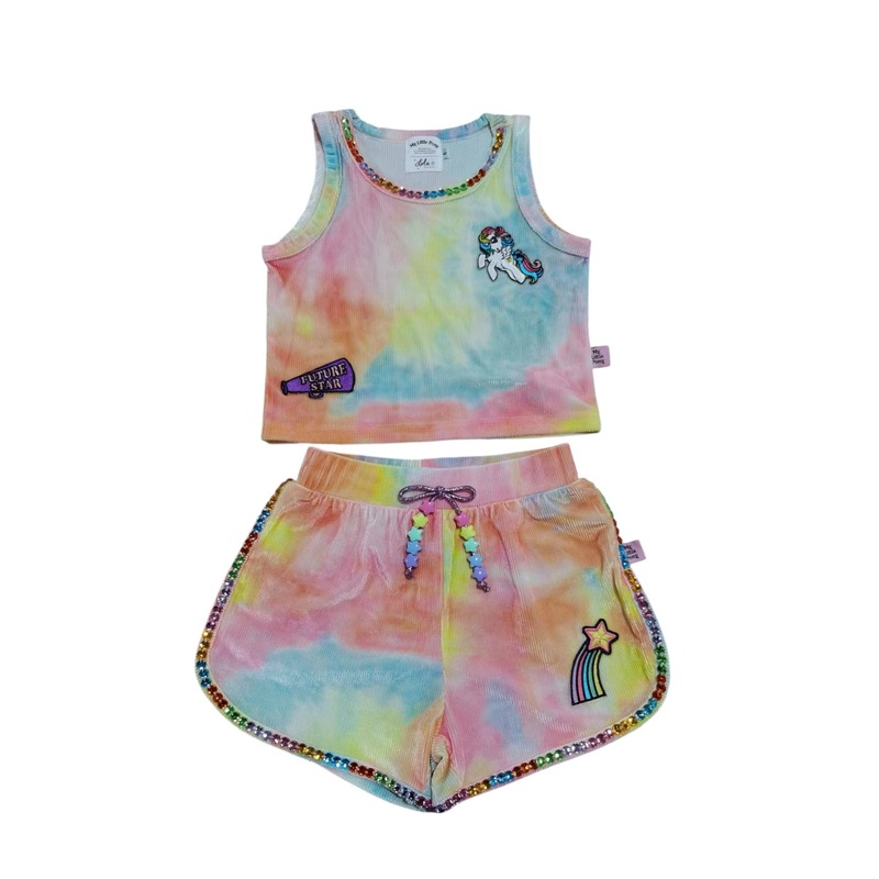 - Vibrant tie-dye tank and shorts set featuring playful My Little Pony patches and dazzling beaded trim