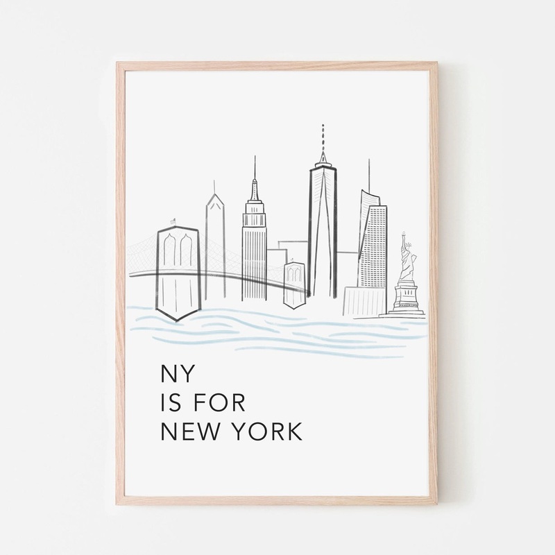Instill a little New York pride while teaching the city's favorite two letters. Hand drawn, this New York art print features New York City's most famous buildings and monuments like the Statue of Liberty, the Freedom Tower, the Empire State Building, the B