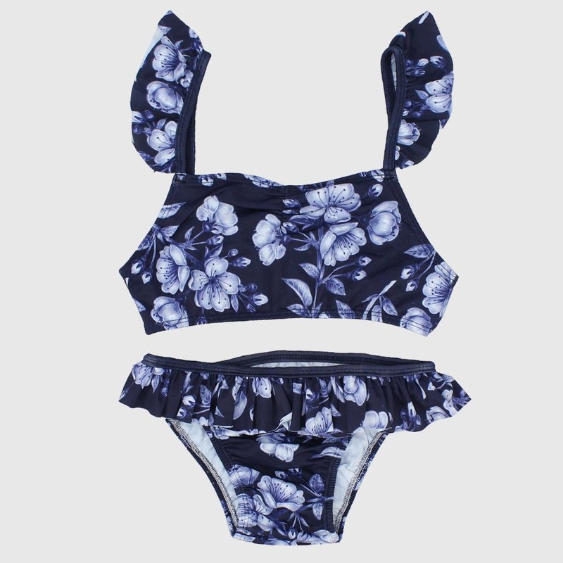 Let your little girl enjoy summer in this gorgeousbikini. It features a 2-piece set of top and bottoms. The bottoms have an elastic band for a perfect fit. The ruffles give it a cute girly look.She’ll make a splash in this set.