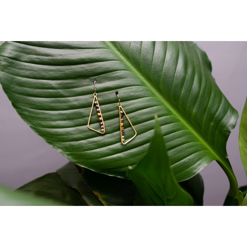 Approach accessorizing from a stylish new angle with our triangular earrings. The long side of a yellow-golden base metal triangle is lined with silver, gunmetal, gold, and copper colored geometric beads attached with wrapped base metal wire. Each earring finished with a base metal hook and measures approximately 1.75 inches long. Handcrafted in Thailand by at-risk artisans, every piece provides support for themselves and their families.