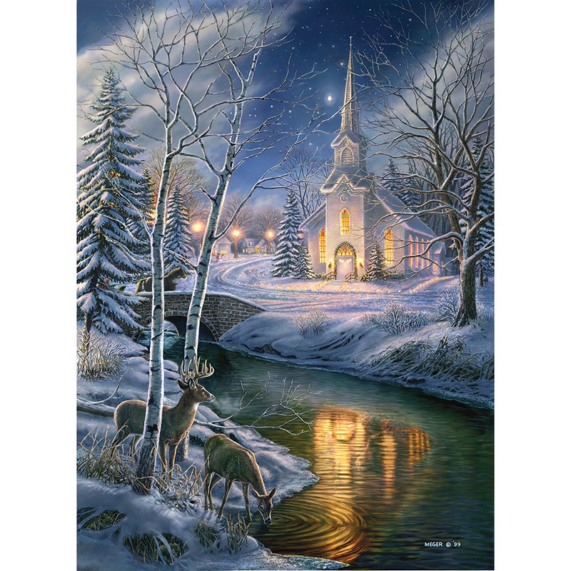 A church lights up the darkness on a cold, silent night in this O Holy Night 1000 PC Puzzle 28462. Snow has blanketed the ground and stars dot the night sky. Two deer have stopped by the creek for a drink before heading on their way again.1000 piecesDimens