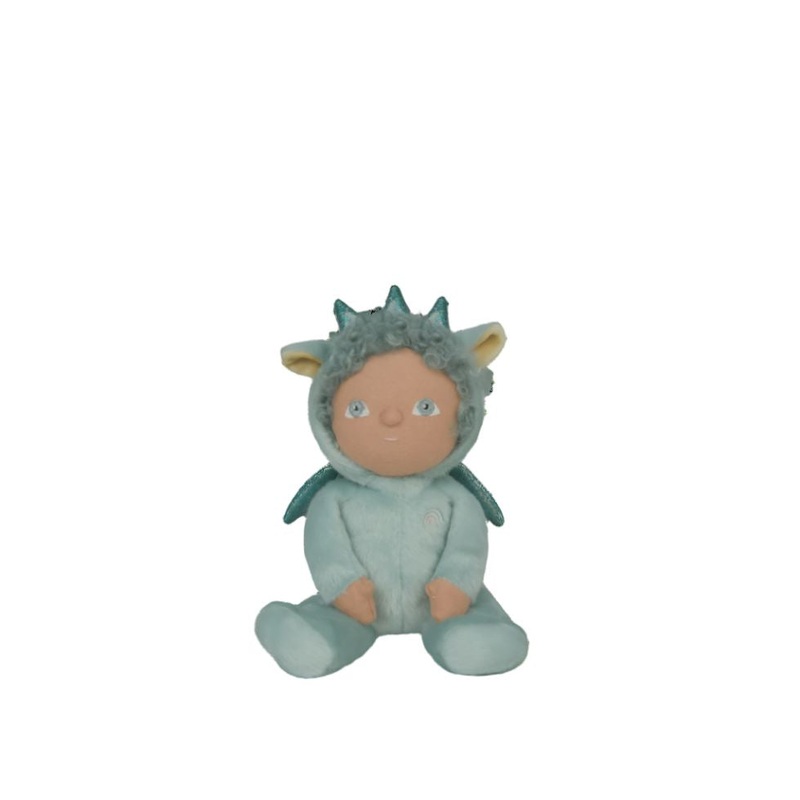 Soft and cuddly, snuggled in a non-removable dragon onesie with iridescent wings and horns.