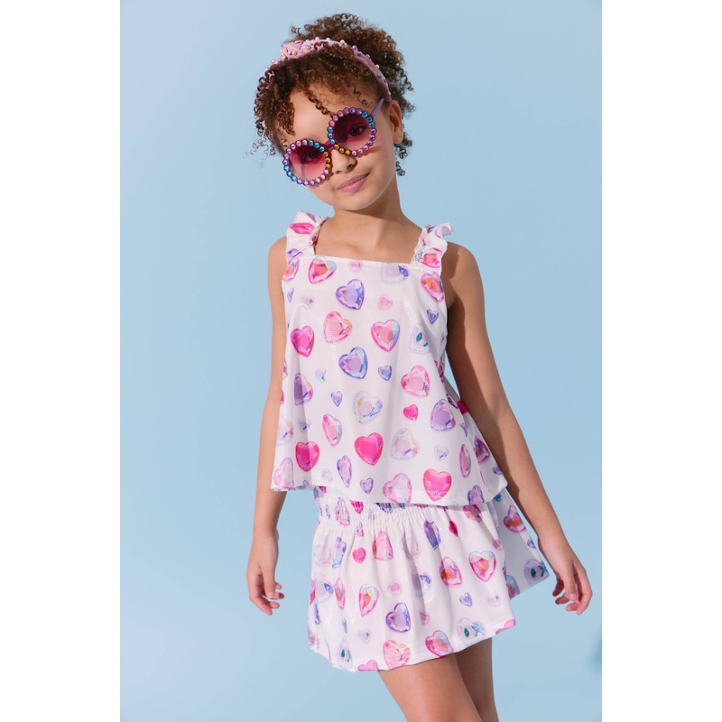 Description:All-over gem heart print in vibrant ombre hues for a fun, colorful look.Sleeveless tank with delicate ruffle straps paired with a matching flowy skirt.Perfect for warm-weather outings, playdates, or adding a playful touch to any day.Material &