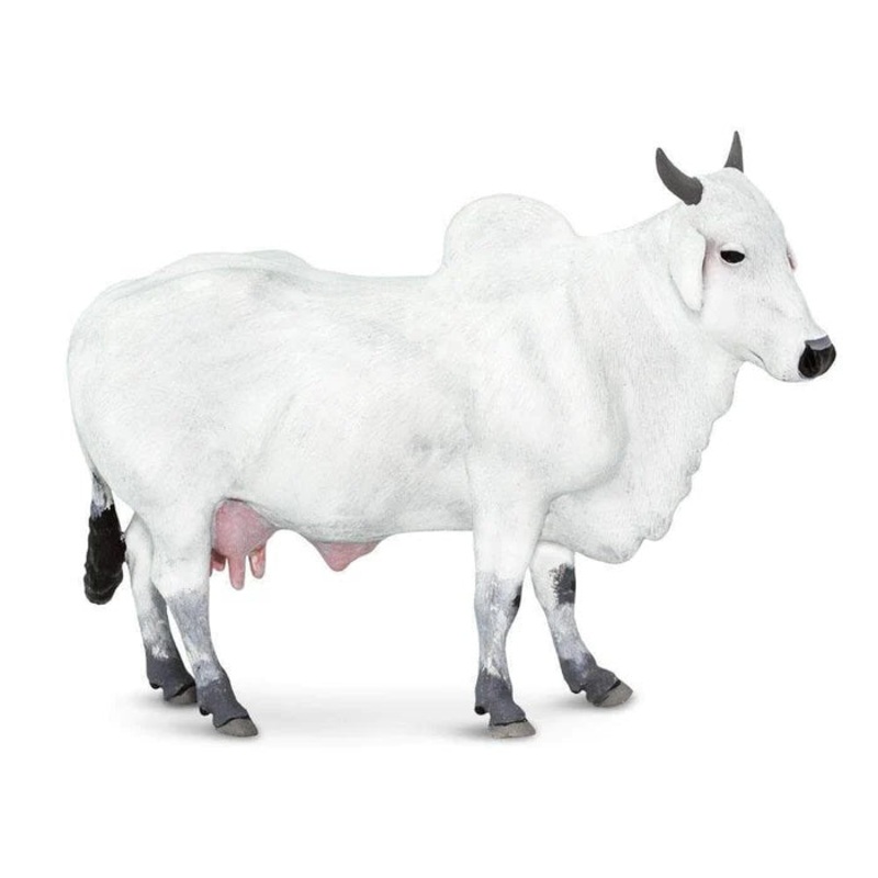 The Ongole Cow is a breed found in India. They are known for their drooping ears, large shoulder hump, and flap of loose skin at the chest called a dewlap. This hand-painted Ongole cow has a white body with gray on its hooves and horns.Scientific Name: bos
