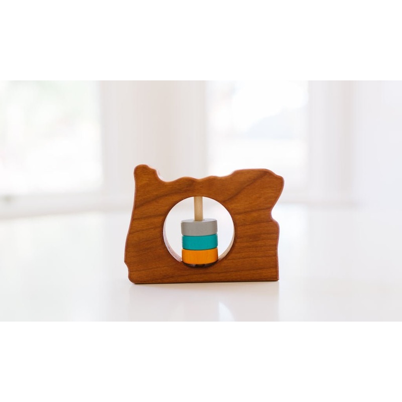 Show your state pride with the OregonStateshaped baby rattle. This rattle is made from solid hardwood Cherry. This baby rattle is 100% organic, made from responsibly harvested woods, and is sure to last long enough to be passed down through several generat