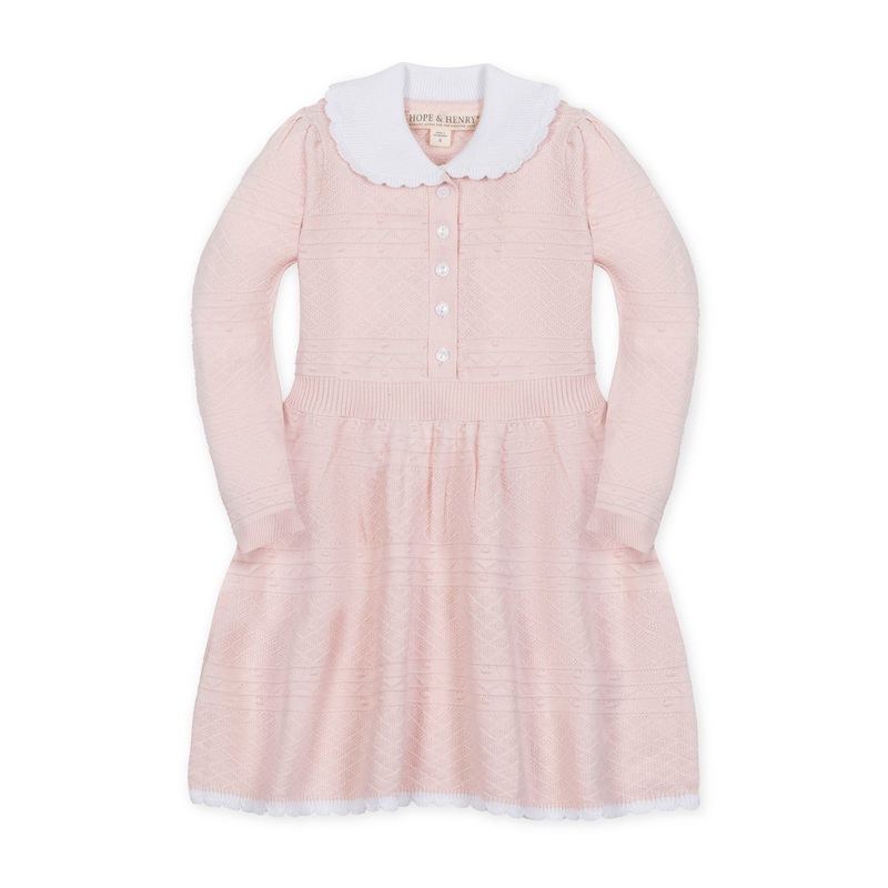Meet one of our newest fall favorites for girl - this perfectly put-together long sleeve sweater dress in soft organic cotton. Features a sweet peter pan collar, cable knit detail, gold buttons at the cuffs, and a back keyhole closure for easy dressing. An